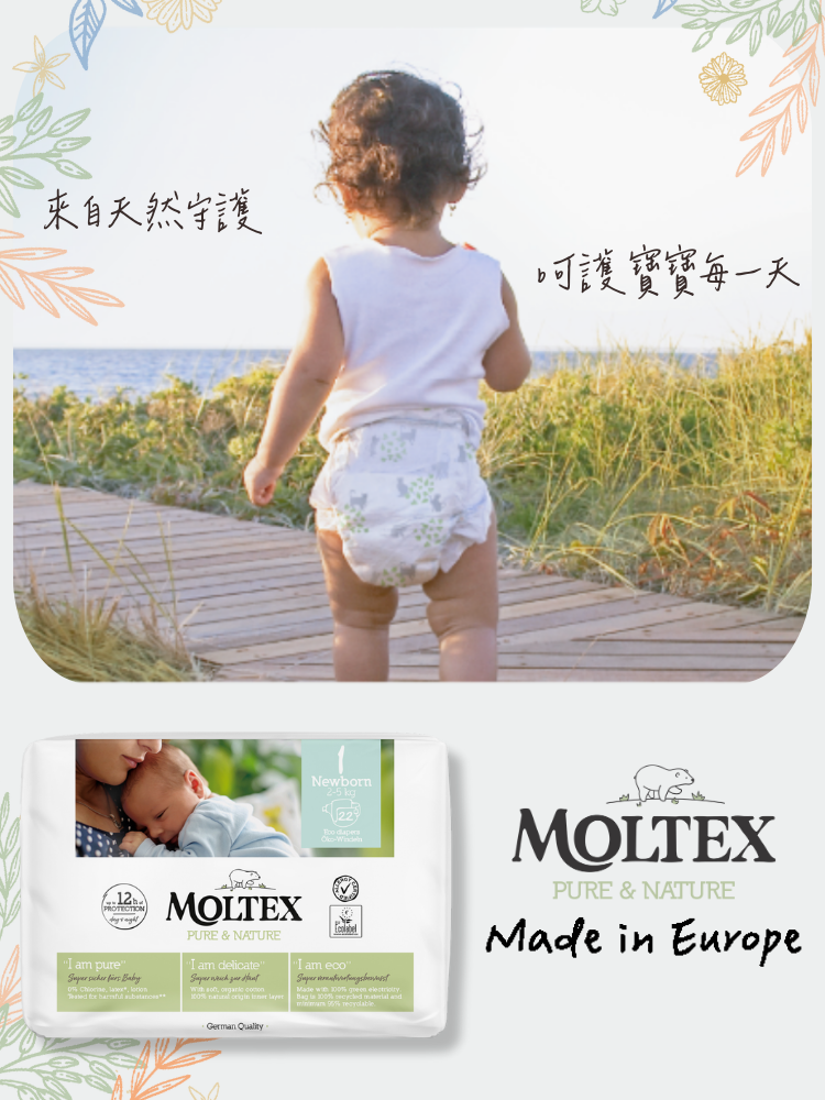 給寶寶最天然的守護 Moltex 歐洲頂級純天然透氣紙尿片專為嬰幼兒脆弱肌膚設計,讓每一次貼合都舒適自在。 -6款不同尺寸,涵蓋新生兒到活潑寶寶,成長每一步都有合適的守護 -高透氣不織布,保持乾爽不悶熱 ,減少尿布疹風險 -柔緻腰圍不勒肚,活動更自在 -專利SecondDry技術,獨特瞬吸系統,快速鎖水 - 持續12小時吸濕,夜晚安心不打擾 - 100% 無添加香料 & 化學漂白 - 環保材質,守護地球同時守護寶寶 -歐洲製造,歐洲品質保證 -通過國際過敏認證及歐盟皮膚權威機構 5星敏感測試認証 給寶寶最安心的呵護,從選擇開始! 選擇 MOLTEX,天然安心,讓寶寶自在成長,爸媽更放心!