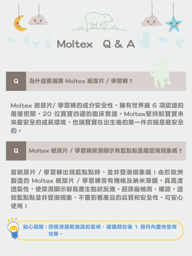 給寶寶最天然的守護 Moltex 歐洲頂級純天然透氣紙尿片專為嬰幼兒脆弱肌膚設計,讓每一次貼合都舒適自在。 -6款不同尺寸,涵蓋新生兒到活潑寶寶,成長每一步都有合適的守護 -高透氣不織布,保持乾爽不悶熱 ,減少尿布疹風險 -柔緻腰圍不勒肚,活動更自在 -專利SecondDry技術,獨特瞬吸系統,快速鎖水 - 持續12小時吸濕,夜晚安心不打擾 - 100% 無添加香料 & 化學漂白 - 環保材質,守護地球同時守護寶寶 -歐洲製造,歐洲品質保證 -通過國際過敏認證及歐盟皮膚權威機構 5星敏感測試認証 給寶寶最安心的呵護,從選擇開始! 選擇 MOLTEX,天然安心,讓寶寶自在成長,爸媽更放心!