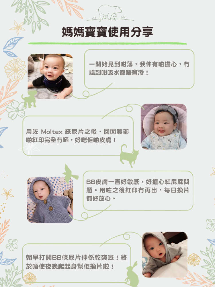 給寶寶最天然的守護 Moltex 歐洲頂級純天然透氣紙尿片專為嬰幼兒脆弱肌膚設計,讓每一次貼合都舒適自在。 -6款不同尺寸,涵蓋新生兒到活潑寶寶,成長每一步都有合適的守護 -高透氣不織布,保持乾爽不悶熱 ,減少尿布疹風險 -柔緻腰圍不勒肚,活動更自在 -專利SecondDry技術,獨特瞬吸系統,快速鎖水 - 持續12小時吸濕,夜晚安心不打擾 - 100% 無添加香料 & 化學漂白 - 環保材質,守護地球同時守護寶寶 -歐洲製造,歐洲品質保證 -通過國際過敏認證及歐盟皮膚權威機構 5星敏感測試認証 給寶寶最安心的呵護,從選擇開始! 選擇 MOLTEX,天然安心,讓寶寶自在成長,爸媽更放心!