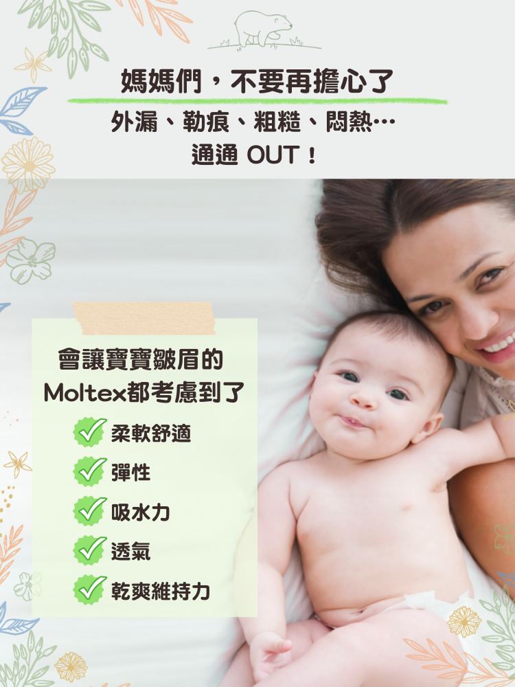 給寶寶最天然的守護 Moltex 歐洲頂級純天然透氣紙尿片專為嬰幼兒脆弱肌膚設計,讓每一次貼合都舒適自在。 -6款不同尺寸,涵蓋新生兒到活潑寶寶,成長每一步都有合適的守護 -高透氣不織布,保持乾爽不悶熱 ,減少尿布疹風險 -柔緻腰圍不勒肚,活動更自在 -專利SecondDry技術,獨特瞬吸系統,快速鎖水 - 持續12小時吸濕,夜晚安心不打擾 - 100% 無添加香料 & 化學漂白 - 環保材質,守護地球同時守護寶寶 -歐洲製造,歐洲品質保證 -通過國際過敏認證及歐盟皮膚權威機構 5星敏感測試認証 給寶寶最安心的呵護,從選擇開始! 選擇 MOLTEX,天然安心,讓寶寶自在成長,爸媽更放心!