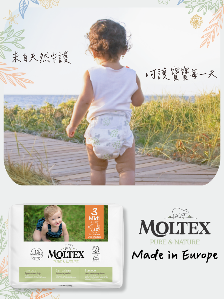 給寶寶最天然的守護 Moltex 歐洲頂級純天然透氣紙尿片專為嬰幼兒脆弱肌膚設計,讓每一次貼合都舒適自在。 -6款不同尺寸,涵蓋新生兒到活潑寶寶,成長每一步都有合適的守護 -高透氣不織布,保持乾爽不悶熱 ,減少尿布疹風險 -柔緻腰圍不勒肚,活動更自在 -專利SecondDry技術,獨特瞬吸系統,快速鎖水 - 持續12小時吸濕,夜晚安心不打擾 - 100% 無添加香料 & 化學漂白 - 環保材質,守護地球同時守護寶寶 -歐洲製造,歐洲品質保證 -通過國際過敏認證及歐盟皮膚權威機構 5星敏感測試認証 給寶寶最安心的呵護,從選擇開始! 選擇 MOLTEX,天然安心,讓寶寶自在成長,爸媽更放心!